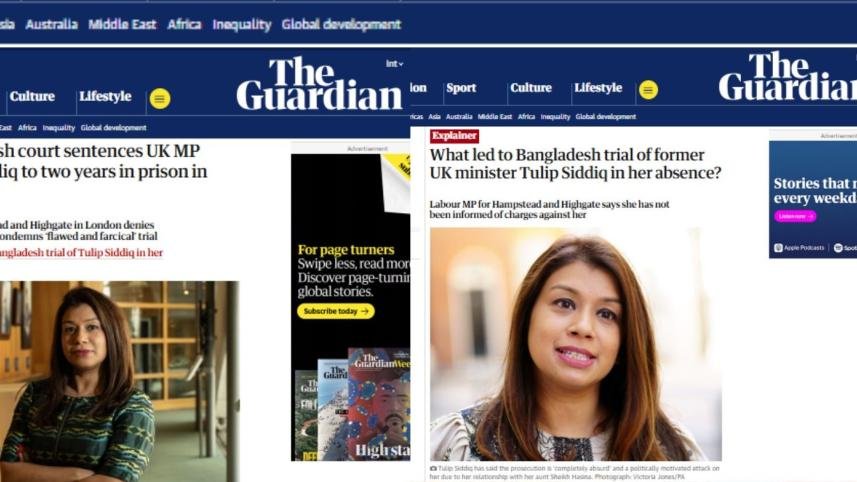 ব্রিটিশ দৈনিক দ্য গার্ডিয়ান তাদের প্রতিবেদনে উল্লেখ করেছে, বাংলাদেশের একটি আদালত দুর্নীতির অভিযোগে ব্রিটিশ এমপি টিউলিপ সিদ্দিককে তার ‘অনুপস্থিতিতেই’ দুই বছরের কারাদণ্ড দিয়েছেন।